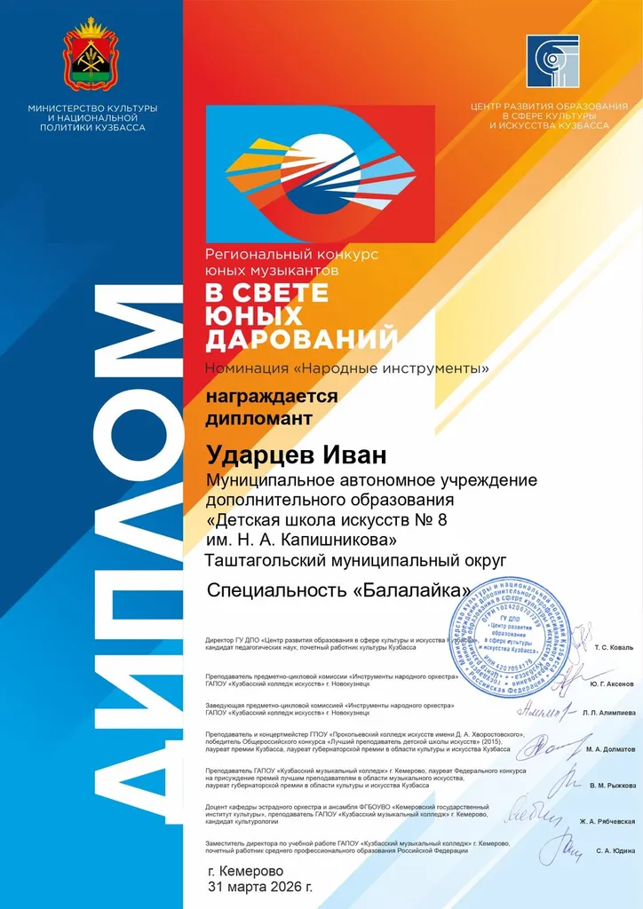 31 марта в ДШИ №69 г. Кемерово прошёл Региональный конкурс юных музыкантов «В свете юных дарований», номинация «Народные инструменты».