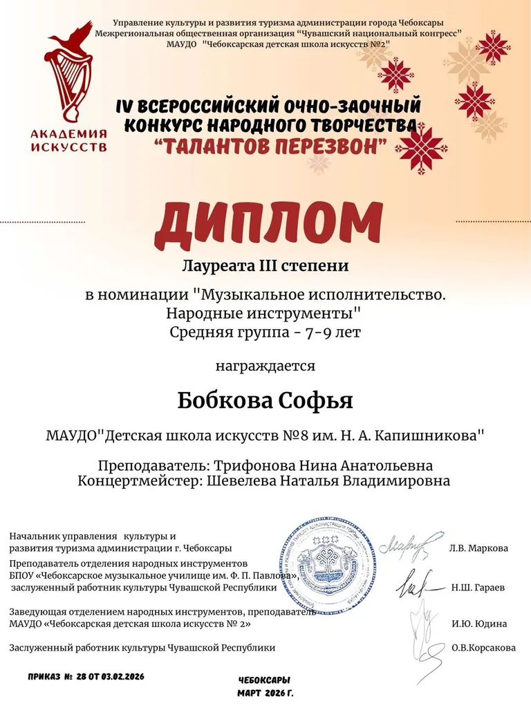 30 марта 2026 г. в МАУ ДО «Чебоксарская детская школа искусств № 2» прошел IV Всероссийский очно-заочный конкурс народного творчества «Талантов перезвон», посвящённый Году единства народов России и Году дружбы народов в Чувашской Республике.